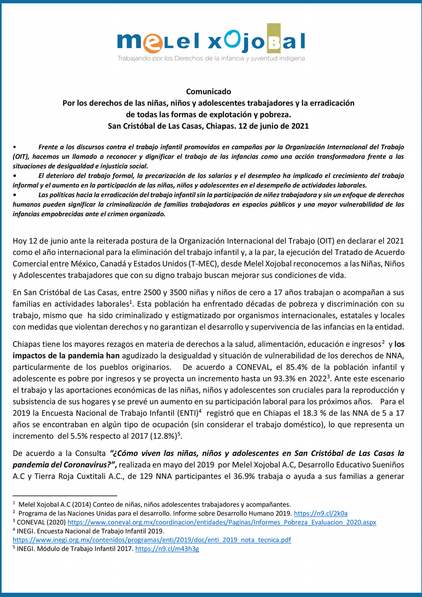 Te invitamos a leer y compartir nuestro comunicado en el marco de este 12 de junio, día donde la OIT declara la erradicación del “trabajo infantil” y que desde Melel lo reivindicamos como el día contra todas las formas de explotación laboral de niñas y niños en el mundo. ¡Sí al trabajo digno y no a la explotación!