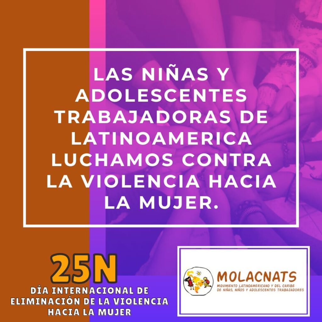 Como MOLACNATS nos unimos a las diferentes campañas nacionales en el marco del #25N Hoy 25 de Noviembre, Día internacional de la lucha contra la violencia hacia la mujer, seguimos en lucha por una sociedad con respeto hacia la todos los derechos. #VivasNosQueremos #NiñasNoMadres #NuestroTrabajoVale https://www.facebook.com/molacnats/photos/a.1060033644049178/4775331685852670/ En este día de lucha, Niñas y Adolescentes trabajadoras, hacen escuchar sus voces. Aleeeeertaaa!!! #VivasNosQueremos #NiñasNoMadres   https://www.facebook.com/molacnats/videos/613784456329012   #Perú #25N| Hoy seguimos levantando nuestras voces por todos los niños y niñas del Perú y el Mundo que han sido víctimas de violencia. ¡VIVA, VIVOS Y LIBRES NOS QUEREMOS! https://www.facebook.com/mnnatsop/photos/a.1487050911612945/3039521113032576/   #Argentina 25 de Noviembre “Día Internacional de eliminación de las violencias hacía las Mujeres y Niñas” En este día de lucha reconocemos la resistencia y organización histórica de las Niñas y Mujeres hacía un sistema opresor. Lxs Niñxs y Adolescentes piden urgente la revisión del mundo adulto, la transformación de las relaciones de poder! A 15 años de la Ley de ESI es imprescindible su real implementación, como también políticas públicas que respondan a las demandas de las infancias! Queremos vidas sin Violencias! Vidas dignas para las Niñas, y las Mujeres! https://www.facebook.com/laveletaylaantena/videos/1243480112819726   #Paraguay Queremos una vida libre de #violencia. ¡Ni una menos! #25NPy #VivasNosQueremos #DíaInternacionalDeLaEliminaciónDeLaViolenciaContraLaMujer    https://www.facebook.com/photo/?fbid=4208450425927493&set=a.579569435482295   #México Necesitamos construir cultura de prevención desde todos los espacios, garantizar una crianza positiva y acompañar en todo contexto de violencia a las niñas y adolescentes, sumar esfuerzos para proponer y exigir políticas públicas en educación, cultura y prevención ante la violencia machista. Solo así, podremos garantizar vidas libres de violencias!!! Las niñas, no se tocan, no se violan, no se desaparecen, ni se matan!!! #25nchiapas #niñezyadolescenciassinviolencias https://www.facebook.com/melelxojobal/photos/a.133095293413059/4529728413749703/   #Colombia En el marco del día internacional de la eliminación contra las violencias hacia la mujer, nos reunimos niñas y mujeres para compartir y conmemorar la vida digna, la resistencia y lucha que millones adelantan en todo el mundo; la cita se llevó a cabo en el barrio Villa Javier en donde hablamos sobre los diferentes tipos de violencia en la sociedad, la familia, y la pareja, igualmente conversamos sobre los derechos que tenemos y las formas que tenemos para hacerlos valer, tuvimos bailes, mística grupal, y sopita de vida. Esperamos afrontar Juntas los retos que no depara la vida, porque vivas nos queremos. https://www.facebook.com/fundacion.creciendounidos/photos/pcb.4558140387609272/4558130750943569/