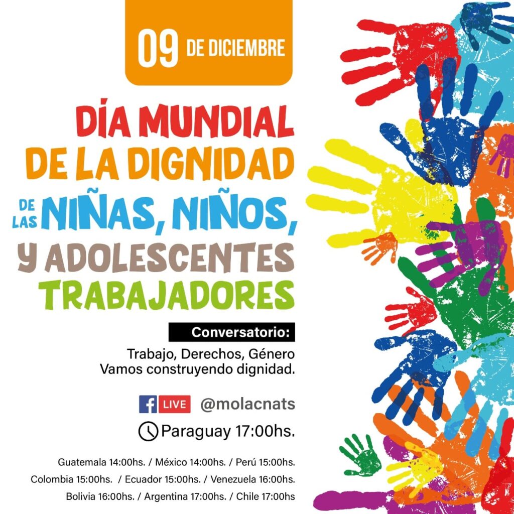 En el marco del 9 de diciembre, “Día Mundia de la Dignidad de las Niñas, Niños y Adolescentes Trabajadores”, desde nuestro movimiento latinoamericano Molacnats, realizamos el Conversatorio: Trabajo, Derechos, Género – Vamos contruyendo Dignidad.   Celebramos nuetro día luchando con nuestras familias, comunidad y región. Por una VIDA DIGNA! Con Garra, Ternura y Solidadridad… Para acceder al conversatorio: https://www.facebook.com/molacnats/videos/423096409492052