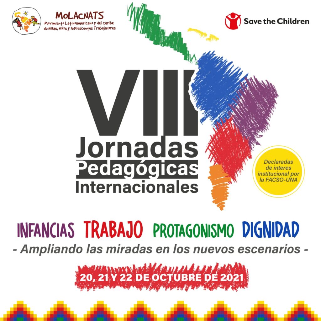 En homenaje a los compañeros Colaboradores Juan Enrique Bazán del Perú (12-07-1950/09-10-2020) y Francisco Estigarribia del Paraguay (04-10-1988/19-09-2018), por la entrega, constancia, dedicación y compromiso hacia la infancia trabajadora de sus países y de América Latina.   Los movimientos y organizaciones articulados en el MOLACNATs, en medio de los complejos escenarios sociales, políticos y económicos en nuestra región, seguimos en la constante y permanente lucha por el reconocimiento y la actoría social y política de todas las infancias y en particular de los NNATs organizados. Durante la celebración del Tercer Encuentro Latinoamericano de NNATs celebrado en la ciudad de Antigua, en Guatemala en 1992 se desarrolló el Primer Seminario Pedagógico Internacional con la presencia de Colaboradores de toda la región de América latina y el Caribe. Como resultado de este primer espacio de reflexión, de análisis y de formación para NNATs y Colaboradores surgen las iniciativas de creación de la Revista NNATs y del Instituto de Formación para Colaboradores de Jóvenes, Adolescentes y Niños Trabajadores (IFEJANTs). Iniciativas que se han consolidado a lo largo de los años y que son instrumentos para la formación y acción pedagógica, política, social militante de cientos de Colaboradores, docentes, trabajadores sociales y estudiantes en los últimos 30 años. En el X Encuentro Latinoamericano celebrado en Asunción en el año 2018, se realizó “El Seminario Internacional sobre “Sistemas Nacionales de Protección Integral y experiencias de inclusión de la participación de Organizaciones de Niños, Niñas y Adolescentes”, espacio abierto a todo público y especialmente a estudiantes, organizaciones sociales e instituciones responsables de la política pública. El Seminario permitió generar un diálogo intergeneracional y multisectorial sobre el protagonismo de las infancias en la construcción de una sociedad sin desigualdades y con pleno cumplimiento de todos los derechos de todos los niños, las niñas y adolescentes. Asimismo, nos permitió recoger insumos para identificar los nuevos desafíos y estrategias de lucha durante estos últimos tres años. En todo este marco, realizaremos las VIII Jornadas Pedagógicas Internacionales para NNATs y Colaboradores del MOLACNATs, y abierto especialmente a estudiantes, movimientos sociales, servidores públicos y de organismos internacionales, en el mes de octubre 2021, en el marco de la Celebración del XI Encuentro Latinoamericano del movimiento, el cual, por primera vez en 30 años, se realizará de forma virtual. Objetivo: La llamada “nueva normalidad” nos invita a estar atentos, atentas, y a ser creativos para el desarrollo de líneas de acción y estrategias en el corto, mediano y largo plazo, para el cumplimiento de los objetivos que de manera orgánica nos hemos planteado desarrollar desde nuestra última asamblea presencial en el año 2018, objetivos que nos corresponde evaluar y relanzar junto a los nuevos retos para el próximo trienio 2022 al 2024. En esta VIII edición de nuestras jornadas pedagógicas, queremos propiciar el debate entre colaboradores, el mundo académico, representantes de los organismos internacionales y las Niñas, los Niños y Adolescentes Trabajadores, para evidenciar las nuevas miradas sobre el complejo mundo del trabajo y de las infancias en los escenarios presentes y futuros. Metodología La virtualidad que se viene imponiendo a escala mundial supone un gran desafío en el acceso y uso de las diferentes redes sociales, particularmente para los Nats y Colaboradores, como herramientas y medios para la transformación social, política, económica y cultural de nuestros pueblos. Se desarrollarán tres eventos virtuales con la modalidad de seminarios, con la presencia de referentes académicos internacionales, expertos, representantes de organismos internacionales y los propios NNATs de los movimientos y organizaciones del MOLACNATs. Esperamos contar con la presencia de varios miembros del Comité de Derechos del Niño de Ginebra, en calidad de ponentes y de invitados, así como con el apoyo del mundo académico. Al final de cada seminario, se presentará una síntesis de las exposiciones, los nudos críticos y las recomendaciones identificados por cada expositor. Al finalizar esta síntesis, cada expositor/a tendrá un espacio/tiempo para validar y complementar. También, un representante de una universidad, en base a las exposiciones, presentará los desafíos identificados para la academia. Las plataformas habilitadas permitirán a los y las participantes interactuar con comentarios y preguntas que serán recogidos para que cada expositor y expositora, responda o realice aportes a las reflexiones del auditorio. Al final de los tres seminarios, se tendrá una sistematización en documento PDF que se levantará en la página web del movimiento: www.molacnnats.com Las jornadas pedagógicas se desarrollarán los días 20, 21 y 22 de octubre, en seminarios de 4 horas de duración, de manera virtual, utilizando plataformas que permitan diferentes modalidades de participación. Para inscripción: https://docs.google.com/forms/d/e/1FAIpQLSc-rYiWGf1pRslC0HR4NRvkAbCx7TiaxwxD_ZWW-eOGJFA3wQ/viewform