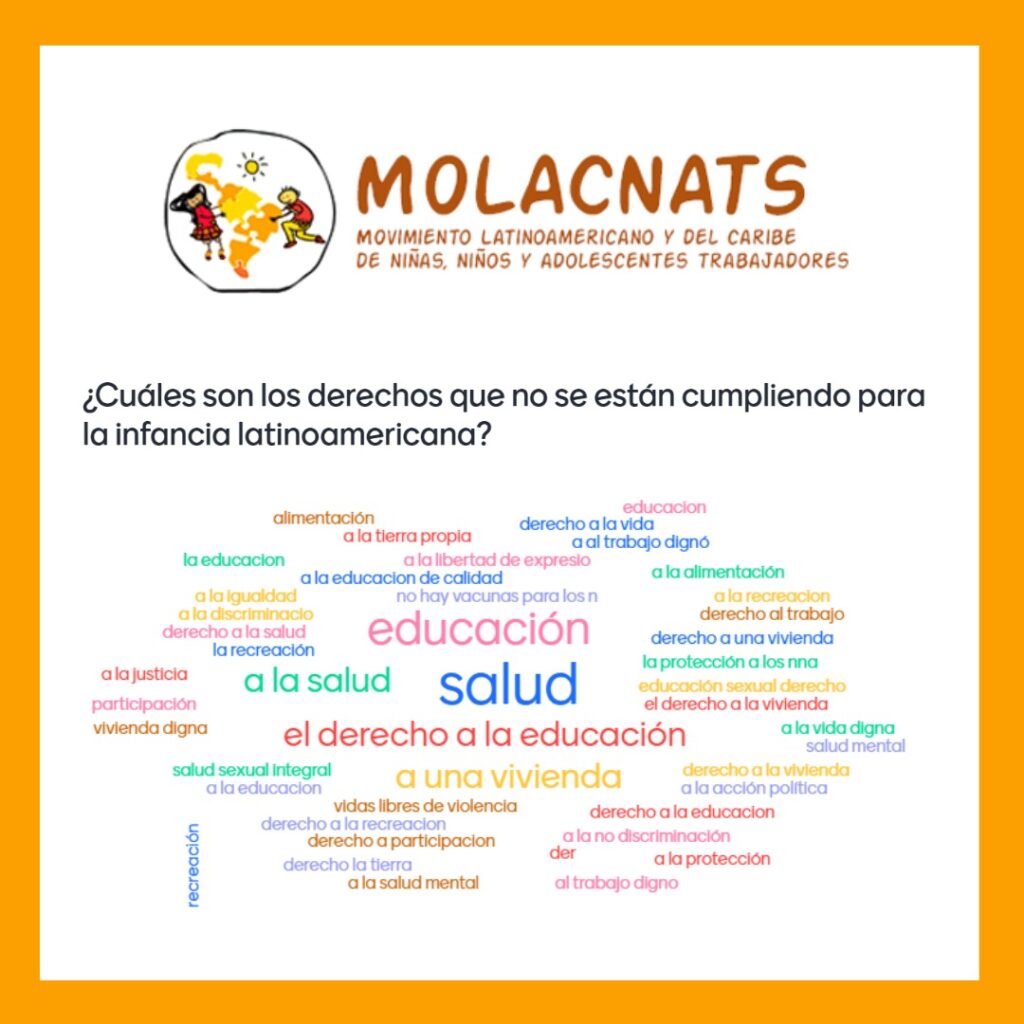 NNATs de América Latina exigimos trabajo digno en el marco de la conmemoración por el Día Internacional de las y los trabajadores. Con motivo de la conmemoración en el marco del Día Internacional de las y los trabajadores, salimos a las calles. Nosotros los NNATs de diferentes países de América Latina realizaron un conjunto de actividades para dar a conocer nuestras principales demandas y propuestas en torno a esta fecha clave en las infancias trabajadoras. En Argentina, los NNATs exigieron al Estado políticas contra todo tipo de explotación hacia las infancias y sus familias. «✊💭 ¡Feliz día de la lucha! ¡Por el reconocimiento de niñas, niños y adolescentes trabajadores! Nuestra lucha es por la defensa del trabajo como derecho humano, digno y liberador. Exigimos al Estado políticas contra todo tipo de explotación hacia las infancias y sus familias. Invitamos a deconstruir las prácticas de ocultamiento de la identidad de lxs niñas, niños y adolescentes trabajadores organizadxs. Feliz día a lxs NNATs y sus familias ✊». En Venezuela, los grupos de base de la CORENATs conmemoraron el 1 de mayo. «Niñas, niños y adolescentes del grupo de base Boconats de la comunidad de Altamira en el Estado Trujillo, celebran con obra de teatro, la reflexión y procesión del Santo Patrón San Isidro Labrador, el 1 de mayo, Día Internacional de los Trabajadores y trabajadoras». En Paraguay, se recordó que los NNATs no somos delincuentes, sino que somos parte de la solución y exigimos un trabajo digno. “#01demayo Alerta, alerta que caminan, los NNATs organizandos por América latina. Hoy 1 de mayo, en el Día de las y los Trabajadores, exigimos junto a nuestras familias y la clase trabajadora, mejores condiciones laborales. Los NNATs somos personas productivas con identidad, dignidad; no somos delincuentes, luchamos por salir adelante, buscamos ser parte de la solución y no de la resignación; somos protagonistas de nuestra propia vida, luchamos a diario con dignidad, aportamos a la economía familiar y estudiamos. Somos el presente y el futuro, nos sentimos parte de la construcción de una sociedad justa, digna y solidaria, y exigimos ser coprotagonistas en esta tarea». En Guatemala, los niños, niñas y adolescentes trabajadores participaron en las marchas conmemorativas por el Día de las y los Trabajadores. En Bolivia, los NNATs realizaron diferentes actividades para llamar la atención respecto a la situación actual de la infancia trabajadora. «Niñas, niños y adolescentes trabajadores de Santa Cruz, celebrando el Día del Trabajo con actividades recreativas y un foro para el análisis de su situación actual, saludamos y felicitamos a todas/os los NAT’s del oriente Boliviano, . Asimismo, los NNATs trabajadores de la ciudad de El Alto de la organización CONNATSDEA, otra organización base de la UNATSBO y MOLACNNAT’s, realizaron su foro reunión trataron sobre las estrategias de fortalecimiento organizacional, fuerza compañeras y compañeros, saludamos su compromiso, su fuerza con respeto y solidaridad Y delegados del Consejo de niñas, niños y adolescentes trabajadores organizados de Potosí (CONNATSOP), movimiento integrante de la UNATSBO y el MOLACNNAT’s, ofrecieron una conferencia de prensa invitando al foro del movimiento con la participación de autoridades a nivel municipal y departamental a llevarse a cabo el día miércoles 3 de mayo de la presente gestión. Asimismo, felicitaron a todas/os los valerosos NNATs que día, día luchan por mejores días junto a sus familias. Fuerza, fuerza, fuerza, fuerza compañer@s que la lucha es dura pero venceremos, aleeeerta, aleeerta». En Colombia, nuestros compañeros se organizaron una fiesta de carnaval que sumó a obreros y obreras de los barrios. «Tenemos derecho a tener derechos, libertad, igualdad, fraternidad. Feliz día familia trabajadora’ La movilización del #diadeltrabajo, una conmemoración con mucho sabor de la cultura local San Cristobalense. Se llevó a cabo el primero de mayo, día de la familia trabajadora, fiesta carnaval de los niños niñas adolescentes familias y organizaciones sociales del suroriente, recorrimos las calles y compartimos entre los y las obreras de nuestros barrios». Esta acción se llevó a cabo por la Fundación Creciendo Unidos En Perú, nuestros compañeros y compañeras del MNNATSOP, realizaron acciones de incidencia, en el marco de su reunión nacional de delegados. «Acabamos nuestra reunión con la directora general de Niños, Niñas y Adolescentes del Ministerio de la Mujer y Poblaciones Vulnerables, Maria del Carmen Santiago, para seguir conversando sobre el aplicativo de la SUNAFIL. Ella se comprometió a generar el diálogo con el Ministerio de Trabajo, CPETI y SUNAFIL. Igualmente, nos reunimos con la Adjunta de la Niñez y Adolescencia de la Defensoría del Pueblo, Matilde del Carmen Cobeña Vasquez, para seguir mostrando nuestra preocupación sobre las políticas de erradicación del trabajo infantil por parte del Estado». El MNNATSOP ICA y sus bases participando con la representación de la delegada nacional @Camila Ipurre en el izamiento de la bandera por el Día del Trabajador y por nuestros 30 años de vida orgánica. Y en nuestro tercer día de trabajo [de nuestra reunión nacional de delegados] elaboramos nuestro Plan de Incidencia a nivel nacional y regional para seguir conquistando el cumplimiento de nuestros derechos, en especial en educación, salud, trabajo, y recreación. En Chile, los NNATs exigieron un trabajo y remuneración justa para todos los trabajadores y trabajadoras. «En este día, donde se conmemora a los trabajadores y trabajadoras en todo el mundo, queremos compartir con ustedes el trabajo que realiza “Protagoniza” acompañando la vida de los niños, niñas y adolescentes trabajadores de la comuna de Coronel, continuamos con la Esperanza de que el trabajo sea digno, justo en su remuneración, con un buen trato y buen clima